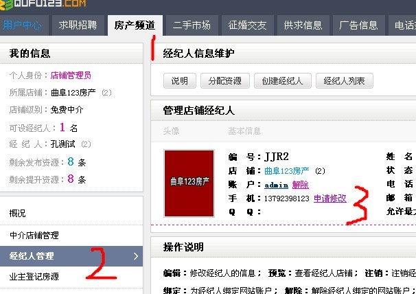 2、點(diǎn)擊房產(chǎn)頻道 -> 經(jīng)紀(jì)人管理,可以看到經(jīng)紀(jì)人的列表,如下圖所示: